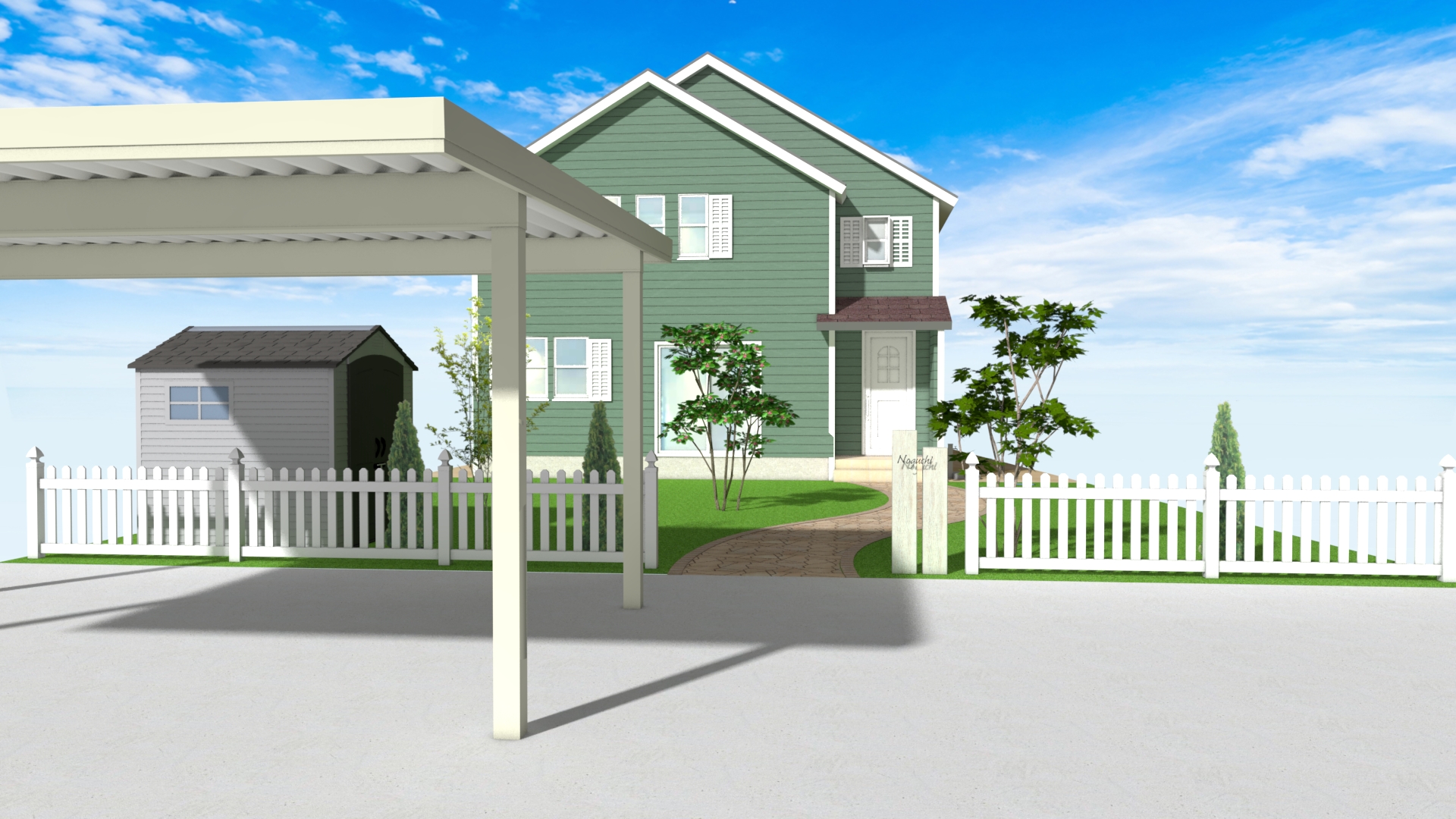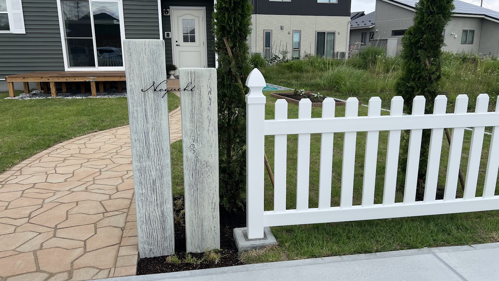 白いバイナルフェンス(PVC製)は輸入住宅の洋風スタイルにぴったりで、リゾート風やアメリカン調の外構事例が多いです。 メンテナンスフリーで耐腐食性が高く、八戸のような雪国に適しています。